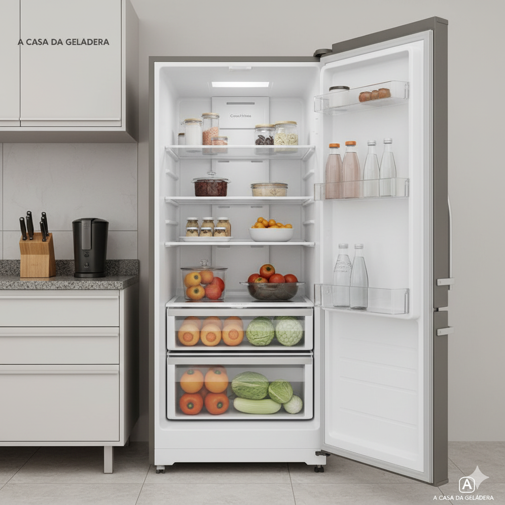 - 2 Pessoas (Casal): Geladeiras de 250 a 350 litros. Um modelo Duplex ou Inverse de tamanho médio costuma atender bem.
