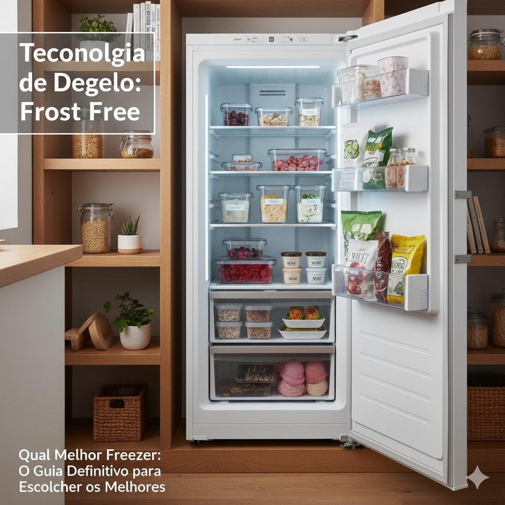 Como Funciona: Freezers Frost Free utilizam um sistema de ventilação interno que distribui o ar frio de forma homogênea e remove a umidade do compartimento, evitando a formação de gelo nas paredes e nos alimentos. Um aquecedor interno entra em ação periodicamente para derreter o pouco gelo que possa se formar, e a água é evaporada para fora do aparelho.